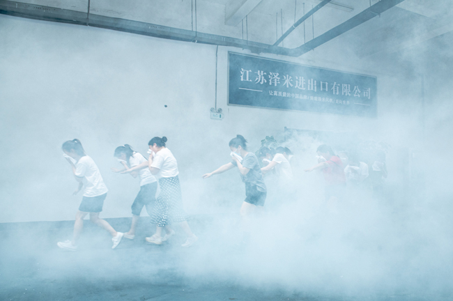 企業(yè)員工在搜救人員的指揮帶領(lǐng)下,彎著腰,貓著步,捂住口鼻,沿著指定路線有序撤離到一樓的安全地帶。