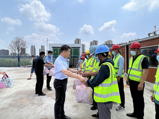 為切實(shí)維護(hù)高溫期間建筑工人身體健康,保障建筑工人在生產(chǎn)過(guò)程中的安全與健康,切實(shí)做好安全文明施工,確保工程項(xiàng)目順利推進(jìn)。7月1日上午,總經(jīng)理劉建華帶隊(duì)慰問(wèn)建設(shè)工程施工現(xiàn)場(chǎng)工人,給他們送去毛巾、香皂、洗發(fā)水等防暑降溫用品,感謝他們對(duì)園區(qū)工程建設(shè)作出的貢獻(xiàn)。