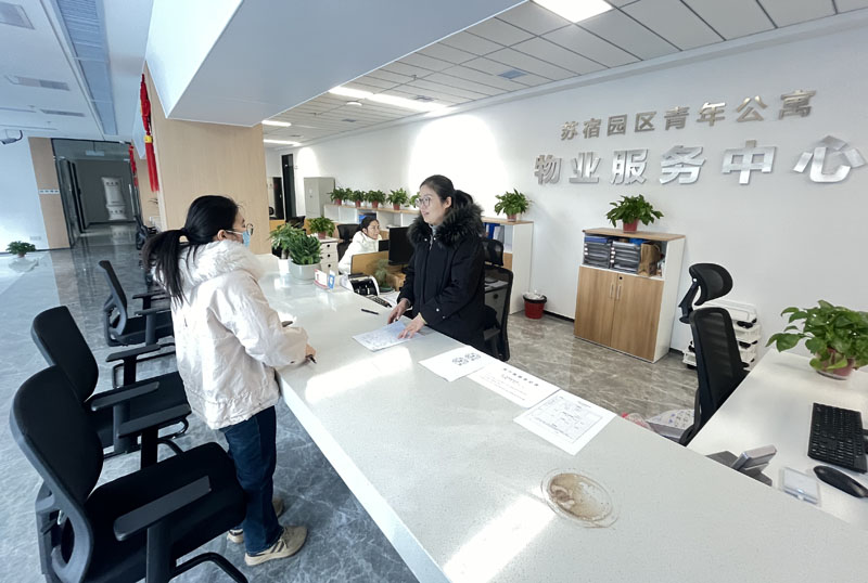 青年公寓作為園區(qū)高品質公寓,主要為園區(qū)企業(yè)人才配套,一經推出便受到企業(yè)一致好評。當天上午,簽約現(xiàn)場一片火熱景象。在工作人員的引導下,意向住客詳細了解公寓的房間設施、周邊配套等情況,并簽定租賃合同,辦理交房相關手續(xù)。