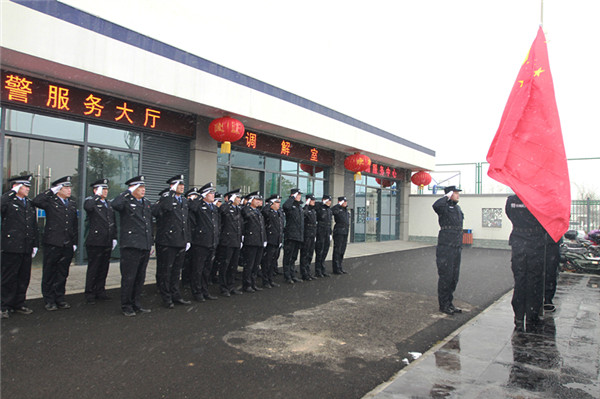 2月8日上午8時50分,根據第三次“忠誠教育周”活動安排,園區(qū)分局全體民警、輔警在分局辦公大樓前冒著大雪舉行升國旗等“忠誠教育周 ”主題活動。